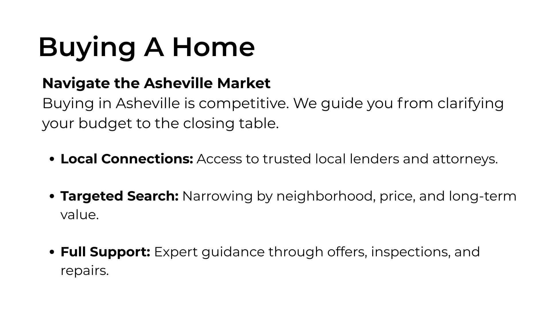 Whether you are buying, selling, or just have a question about the Asheville market, we are here to help. Reach out for a complimentary consultation.